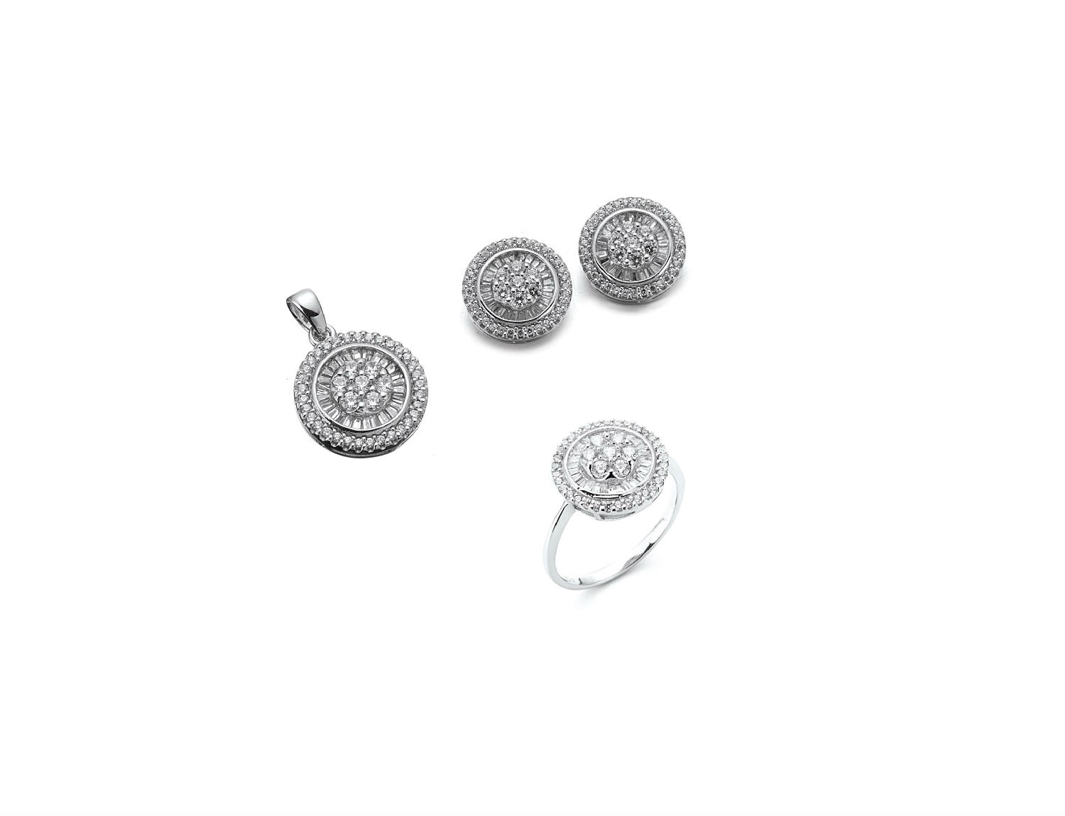 As shown is a jewelry set comes with a ring, a pendant and a pair of earrings in the same design. All stones are White cubic zirconia with rhodium plating. This jewelry set can be worn together or individually to mix with different clothing and present different style.