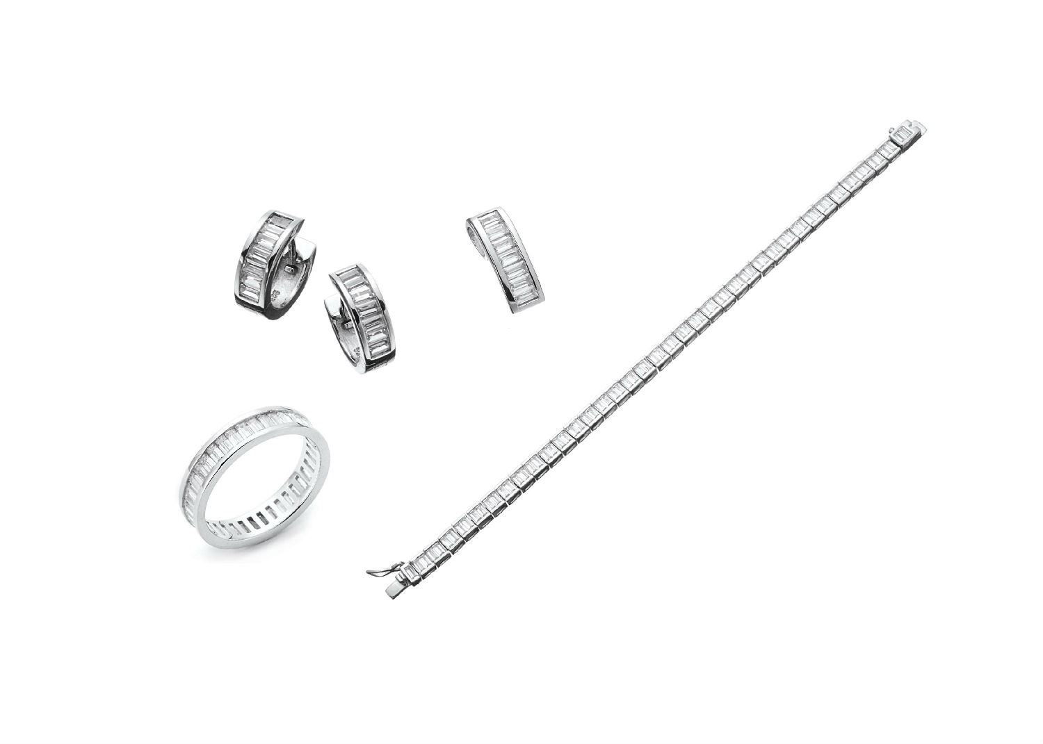 As shown is a jewelry set comes with a ring, a pendant, a pair of earrings and a bracelet in the same design. All stones are white cubic zirconia with rhodium plating. This jewelry set can be worn together or individually to mix with different clothing and present different style.