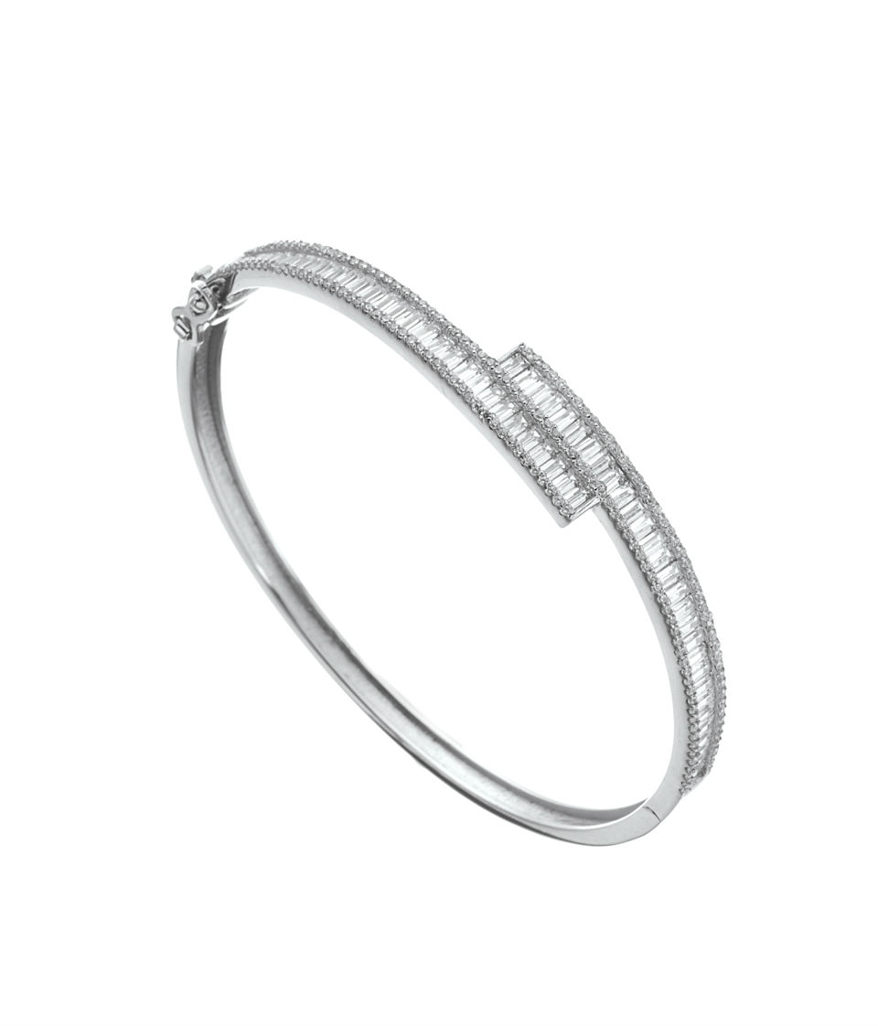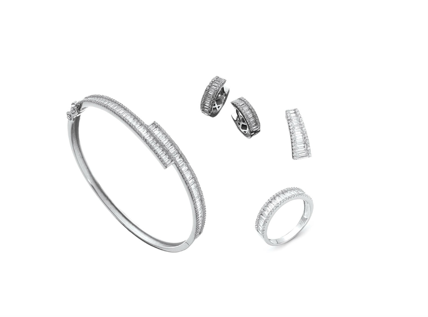 As shown is a jewelry set comes with a ring, a pendant, a pair of earrings and a bangle in the same design. All stones are White cubic zirconia with rhodium plating. This jewelry set can be worn together or individually to mix with different clothing and present different style.