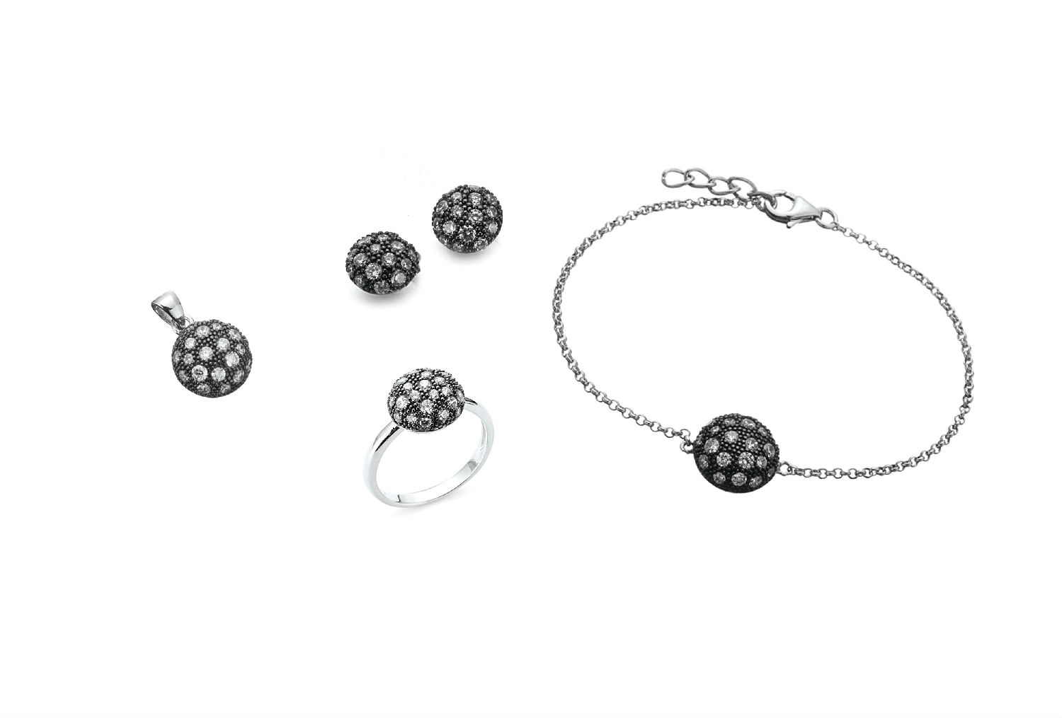 As shown is an energetic jewelry set which comes with a ring, a pendant, a pair of earrings and a bracelet. All set with white cubic zirconia in rhodium and gunmetal plating. It shows young and fashionable. This jewelry set can be worn together or individually to mix with different clothing and present different style.