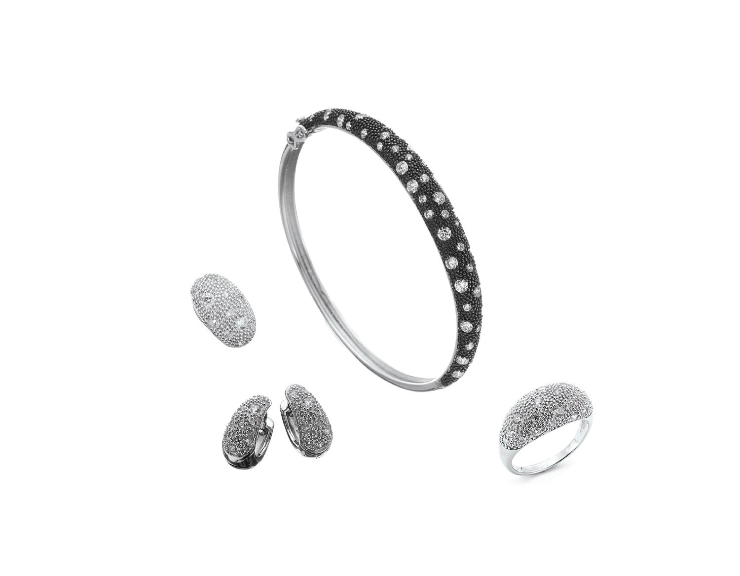 • As shown is an energetic jewelry set which comes with a ring, a pendant, a pair of earrings and a bangle. All set with white cubic zirconia. It shows young and fashionable. This jewelry set can be worn together or individually to mix with different clothing and present different style.
