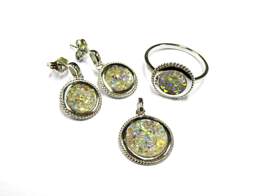 As shown is a jewelry set comes with a ring, a pendant and a pair of earrings in the same design. All stones are glass with Rhodium Plating. The design shows young and energetic. This jewelry set can be worn together or individually to mix with different clothing and present different style.