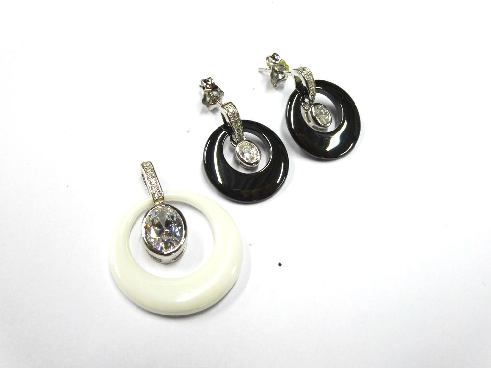 As shown is a ceramic jewelry set comes with a pair of earrings and a pendant in the same design. Each item in the set features an eye-catching ceramic. It shows elegant and luxurious. This jewelry set can be worn together or individually to mix with different clothing and present different style.