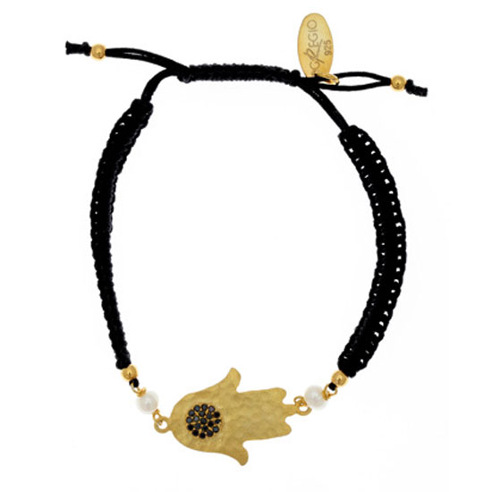 The 925 silver bracelet features a macrame cord in stylish black. It is connected with a Fatima hand completed with a hammer satin finish. The hand is also trimmed with matching black spinel stones.