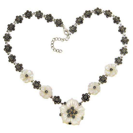 The gorgeous 925 silver necklace features a floral-themed design. It is constructed with marcasite and Mother of Pearl accents in flower shapes. This necklace complements your feminine outfit perfectly.