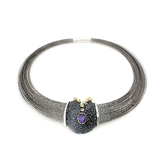 This is an elegant necklace that is finely crafted with refined details. It is crafted of gilded and oxidized 925 silver on the steel cables. The centerpiece is accented with multi-colored stones for added style.