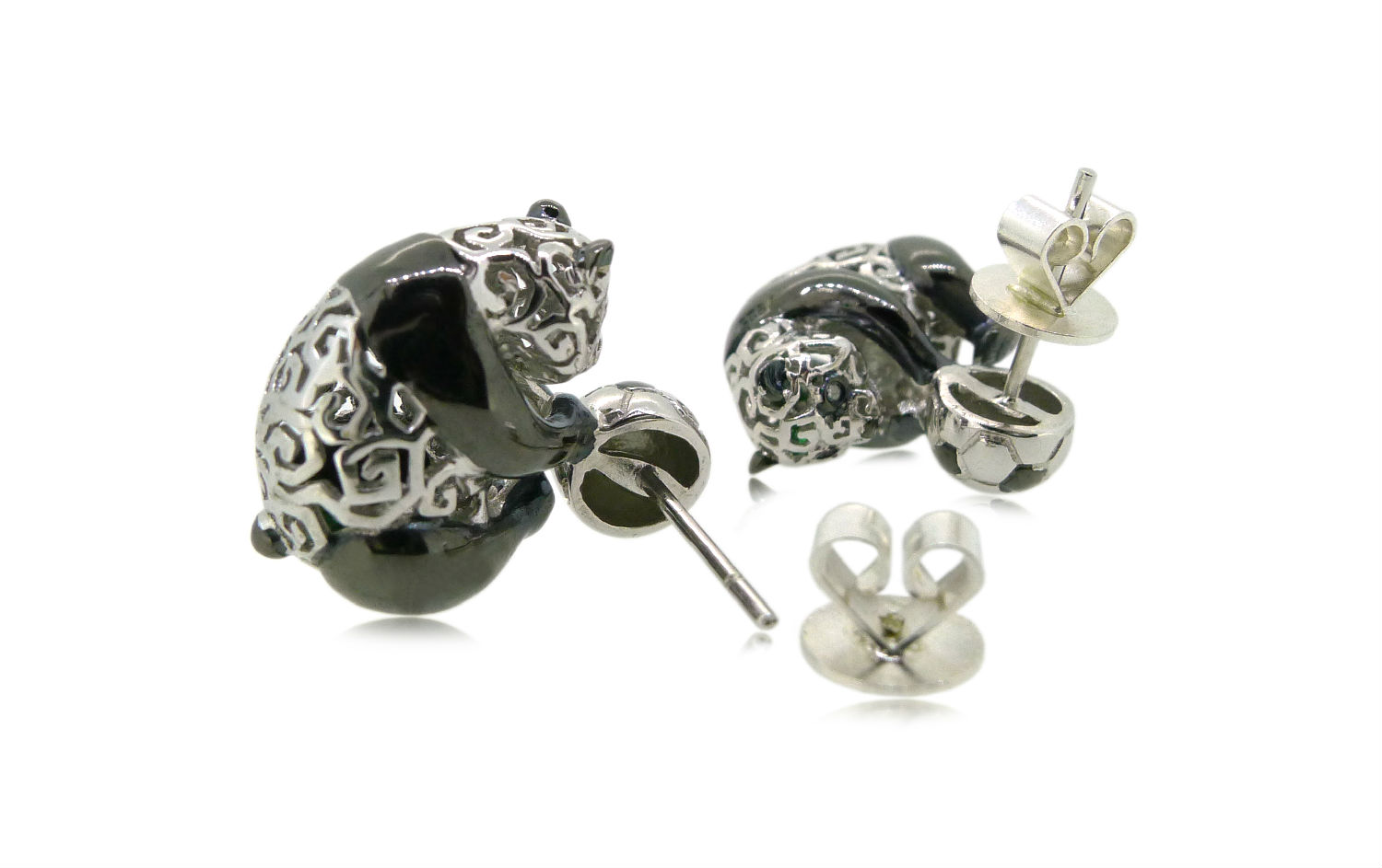 These silver earrings are like a cute Panda, the National treasure of China. The Panda’s body is made with our brand’s special texture. We set the white Swarovski stones in the eyes and also put in many green marquise shape crystals inside the body. When you shake the Panda, all the green crystals will move vividly like the Panda ate the bamboo!