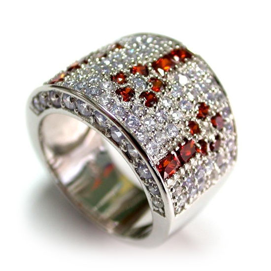 Featured here is a thick silver ring decorated with a large amount of cubic zirconia. Red sparkling stones are arranged in the shape of flowers on a bed of clear stones. The rim of this ring is also decorated with stones for extra glamour.