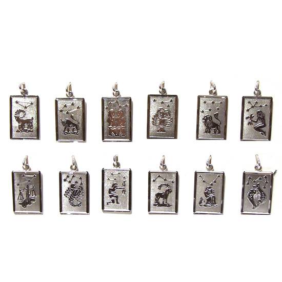 These 925 silver pendants are from Zodiac series. They have rectangular shape and 12 embossed Zodiac icons in the center. Pendants have stone finish background and shiny finish on edges and embossed icons.