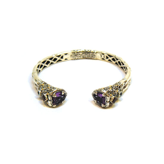This is a 925 sterling silver with gold plating. It is meticulously crafted with sophisticated patterns for added uniqueness. The purple semi-precious stones on two sides accent this design for a touch of charm.