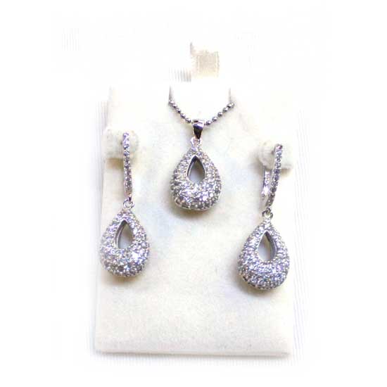 Featured here is a set of necklace and earrings crafted of 925 sterling silver. The elegant jewelry pieces are accented by drop-shaped charms with micro-pave CZ stones. The twinkling earrings and necklace are perfect to accessorize any casual or formal wear.