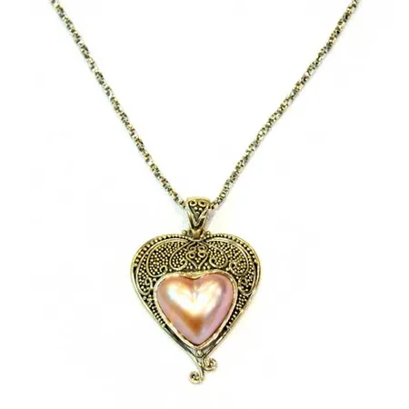 Showcased is a pendant designed in an adorable heart shape. The heart is set with pink mother-of-pearl, which looks gorgeous with natural luster. The setting is embossed with delicate patterns to show a sense of elegance.