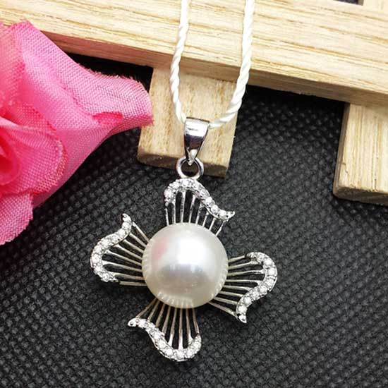 This pendant boasts a chic and trendy design. It is crafted with a big round freshwater pearl in the center for enhanced elegance. The sparkling stone elements add an exquisite touch to this design.