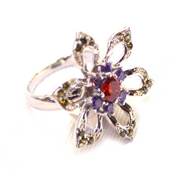 This elegant 925 sterling silver ring features the design of a six-petal flower. The petals and center of the flower are adorned with colorful CZ stones for added attractiveness. The slim ring band showcases a highly polished finish.