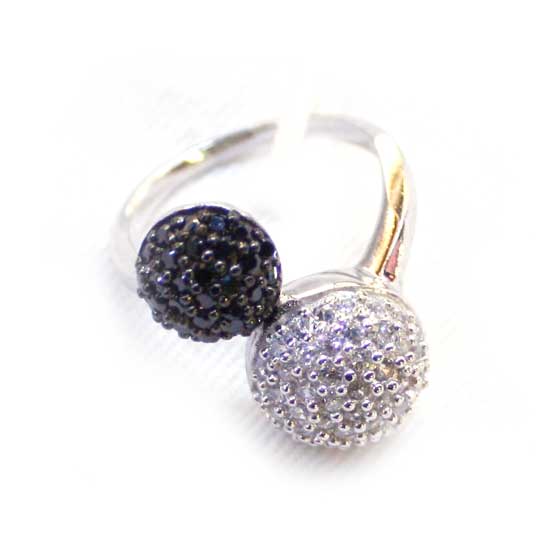 This unique 925 sterling silver ring features two round-shaped heads paved with black and white CZ stones. The highly polished ring band exhibits long-lasting shine. The tasteful silver ring is perfect to accessorize any casual style.