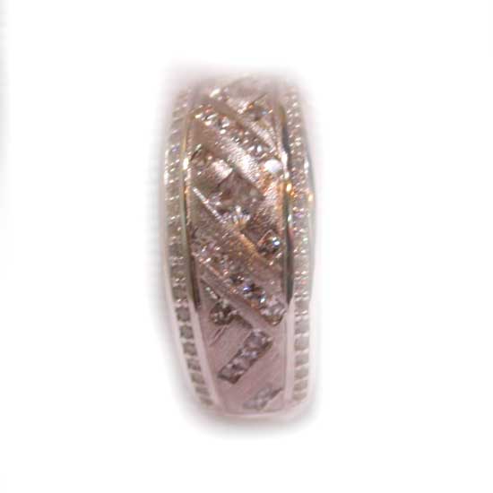 This unique 925 sterling silver ring features cross-over designs on the band. The ring is studded with tiny white CZ stones for a twinkling look. The tasteful silver ring is suitable for everyday wear.