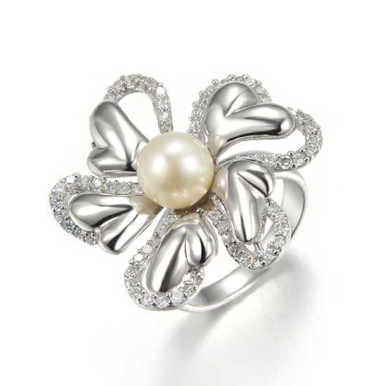 This 925 sterling silver ring features a floral design with heart-shaped leaves. The smooth round freshwater pearl and CZ stones add a glamorous touch to the look effortlessly. This fancy finger ring is a great gift for your loved one.
