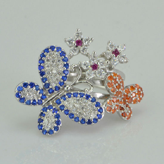 Shine with this flawless sterling silver multi-band ring. The delicately sophisticated design captures the exquisite beauty of two butterflies. The butterfly ornaments with colorful wings are harmonized with the blossoming flowers. Embellished with the glittering gemstones, it offers an air of luxuriousness. Adorn your slender fingure with the ring that will let your look flutter its way to the top.