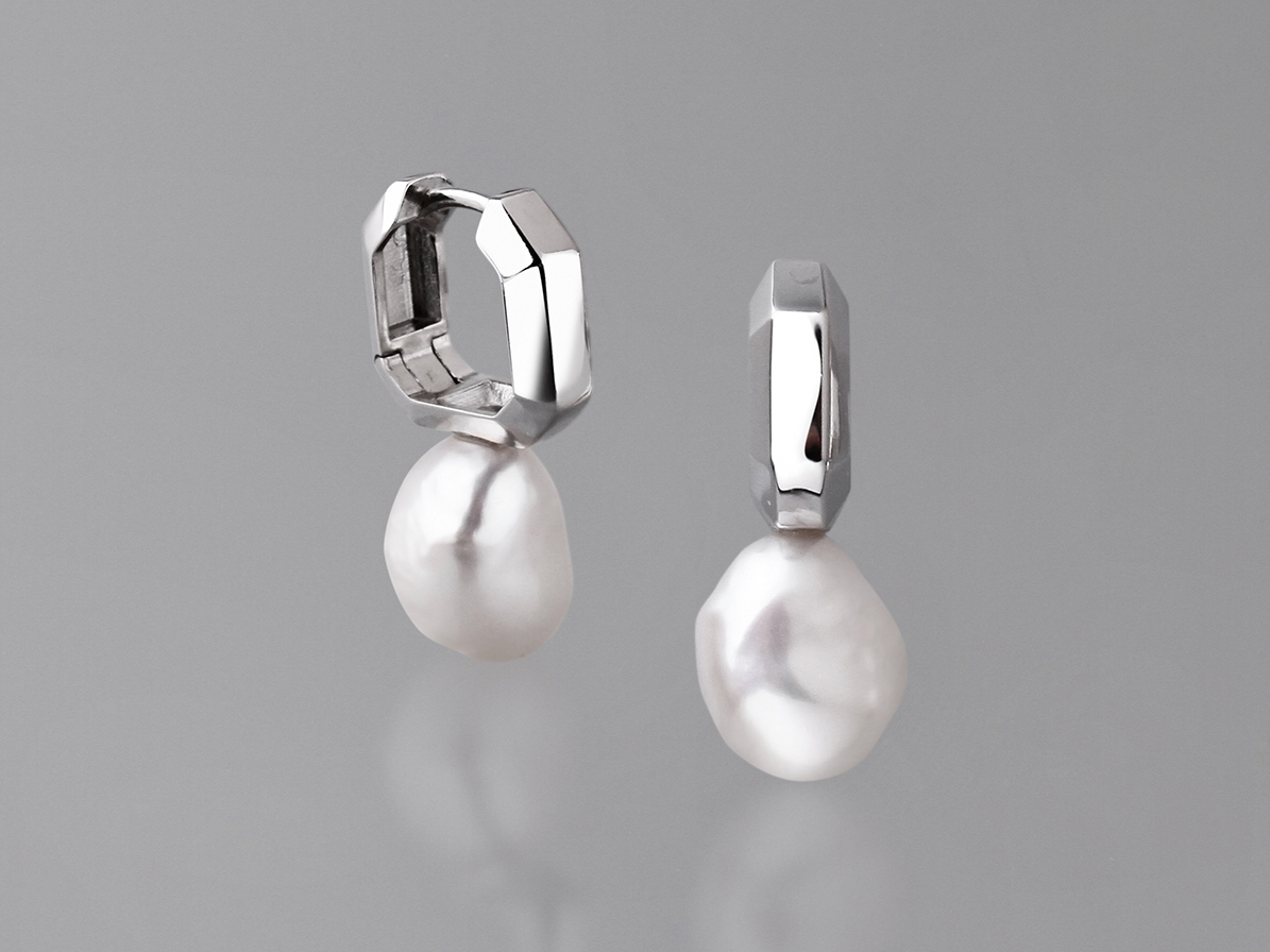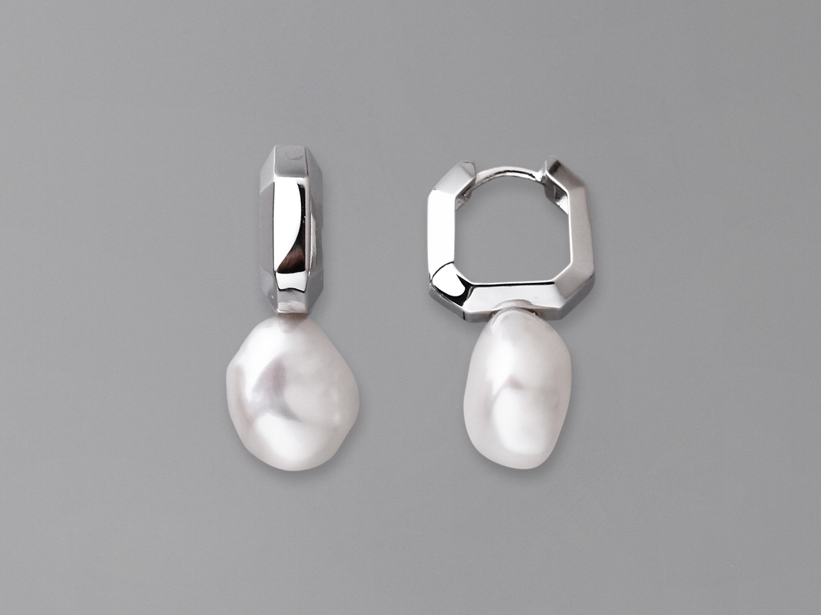 STERLING SILVER EARRINGS WITH 9-10MM IRREGUALR SHAPE FRESHWATER PEARL, RHODIUM PLATED