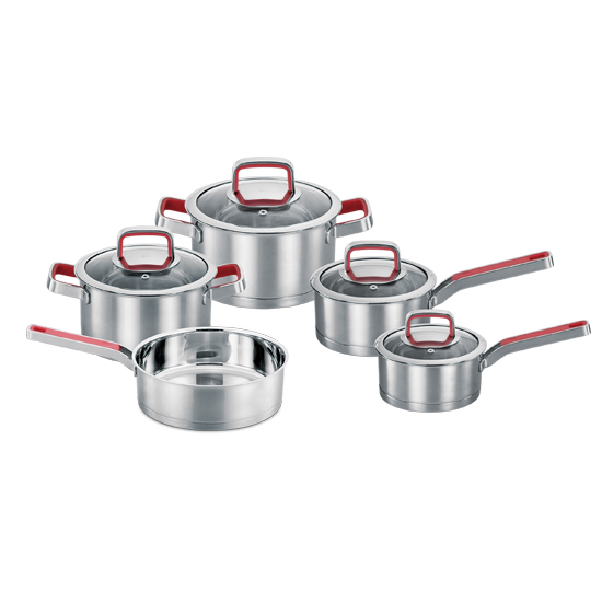 9pcs stainless steel cookware set, 0.6mm body thickness, 4.0mm aluminum impact bonding bottom, 430 induction base, mirror polish inside and outside, s/s handle and knob, T style clear glass lid