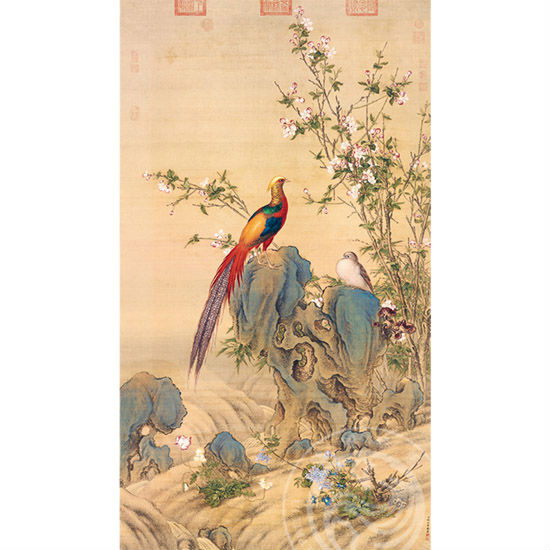 Lang Shih-ning is the Chinese name used by the Italian, Giuseppe Castiglione. At age of 19, Castiglione entered the Jesuit order in Italy as a novitiate, and his early training included painting and architecture. He was subsequently sent to China and arrived in 1715. His artistic skills came to the attention of the emperor, and he served in the inner court during the Kangxi reign (1662-1722), Yongzheng (1723-1735), and Qianlong (1736-1795) reigns as a painter. He combined his previous training with studies of Chinese painting techniques to create a style fusing the best of both traditions. He excelled at depicting figures, birds-and-flowers, and especially dogs and horses. In this painting is a mountain stream flowing down to where pheasants and decorative rocks are seen. By and on the rocks are various flowers, bamboo, and spirit fungi. The subject matter is auspicious for the start of a prosperous New Year and an allusion to the expression “A Brocade of Spring Radiance”- hence, the title of this painting.