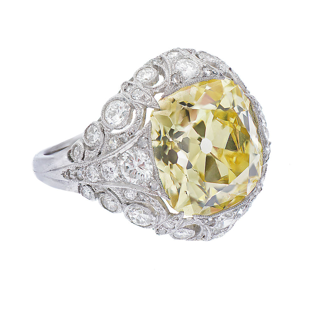 A ring of importance and intricate design, a 7.7 ct fancy intense yellow cushion shape diamond sits in a platinum mount set with old-cut and rose-cut diamonds. Circa 1937. The ring is accompanied by a GIA certificate and certificate form from A . Tillander stating the ring was designed by Oskar Phil Alexander Tillander and handmade by his master goldsmith Georg Buchert.