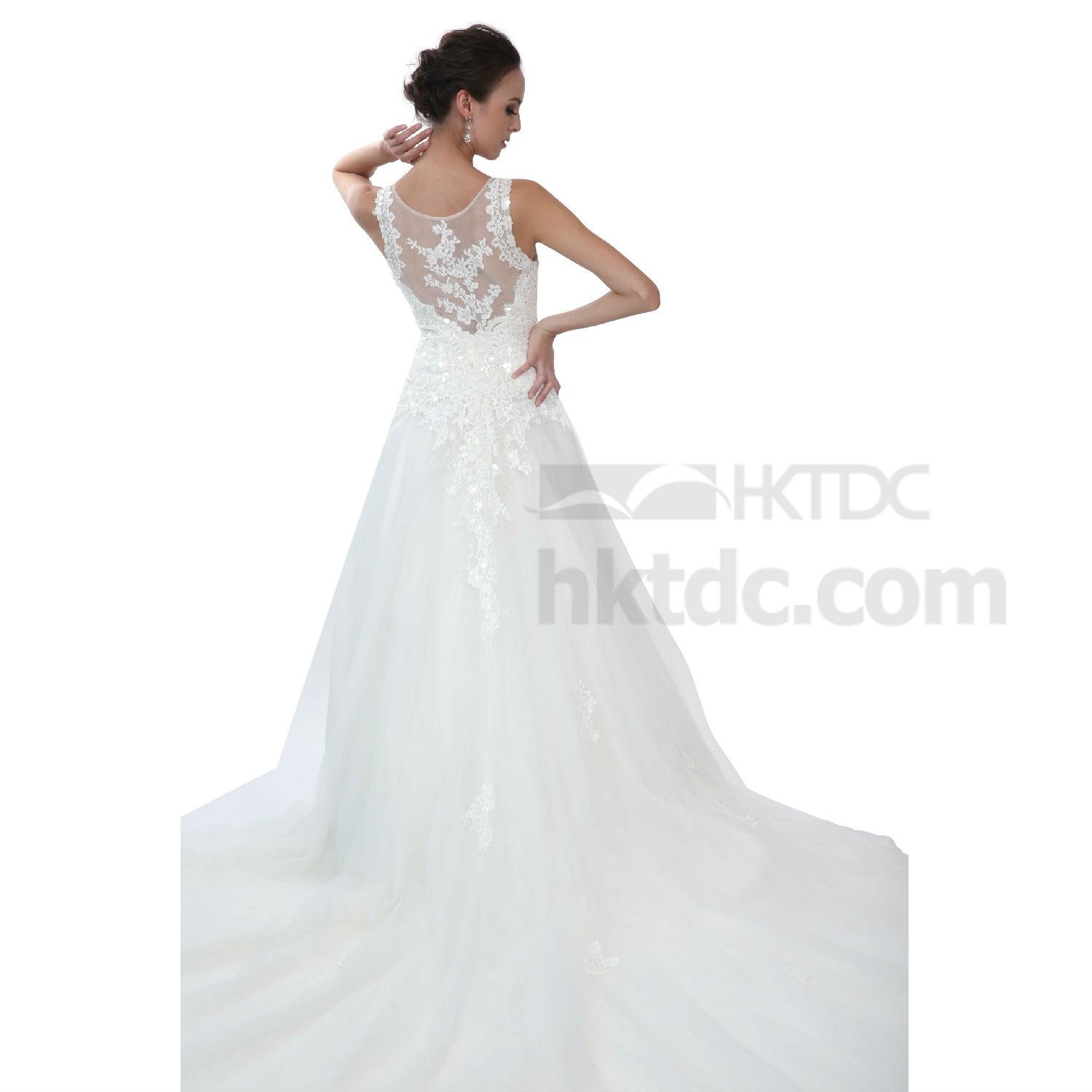 Make a glamorous entrance on your big day with this ravishing gown. The A-line wedding dress finishes clean with a fitted bodice alongside with a signature chapel train that is sure to swing elegantly as you walk down the aisle. Peppered with luscious laces, sequins and embroideries across the sheer, the flaring gown is bound to leave every guest in the room dazzled with amazement.