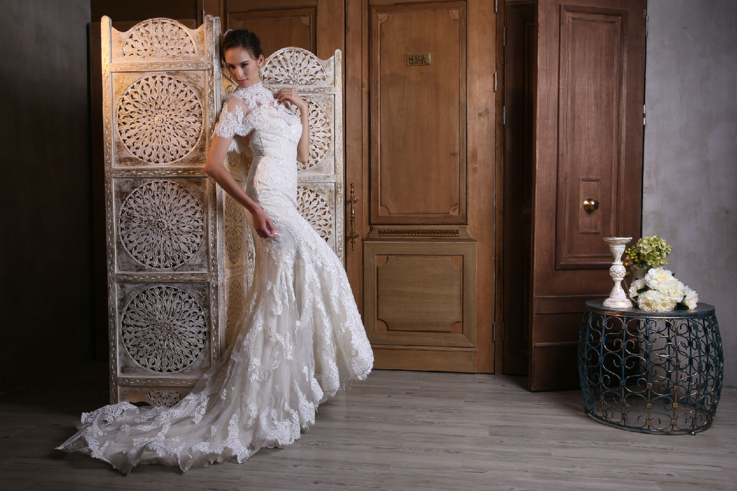 Make your big day spectacular with this breathtaking bridal gown. Trimmed with European laces along the turtle neckline and down to the floaty hemline, it shows off your bewitching curves with a fitted bodice that slims through your waist to accentuate the narrowest part of your body. Cascaded to the ground with a chapel train, it is sure to swing breezily along your every move.