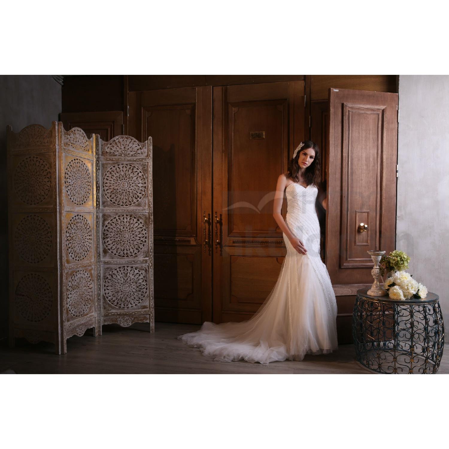 Walk down the aisle in unrivaled charm with this glamorous gown. It envelops your body closely with a sweetheart bodice and slims through your waist and down to the hip to make a grand highlight to your hourglass figure. Studded with Swarovski crystals to draw every envious eye, the A-line gown cascades elegantly onto the ground with an iconic chapel train.