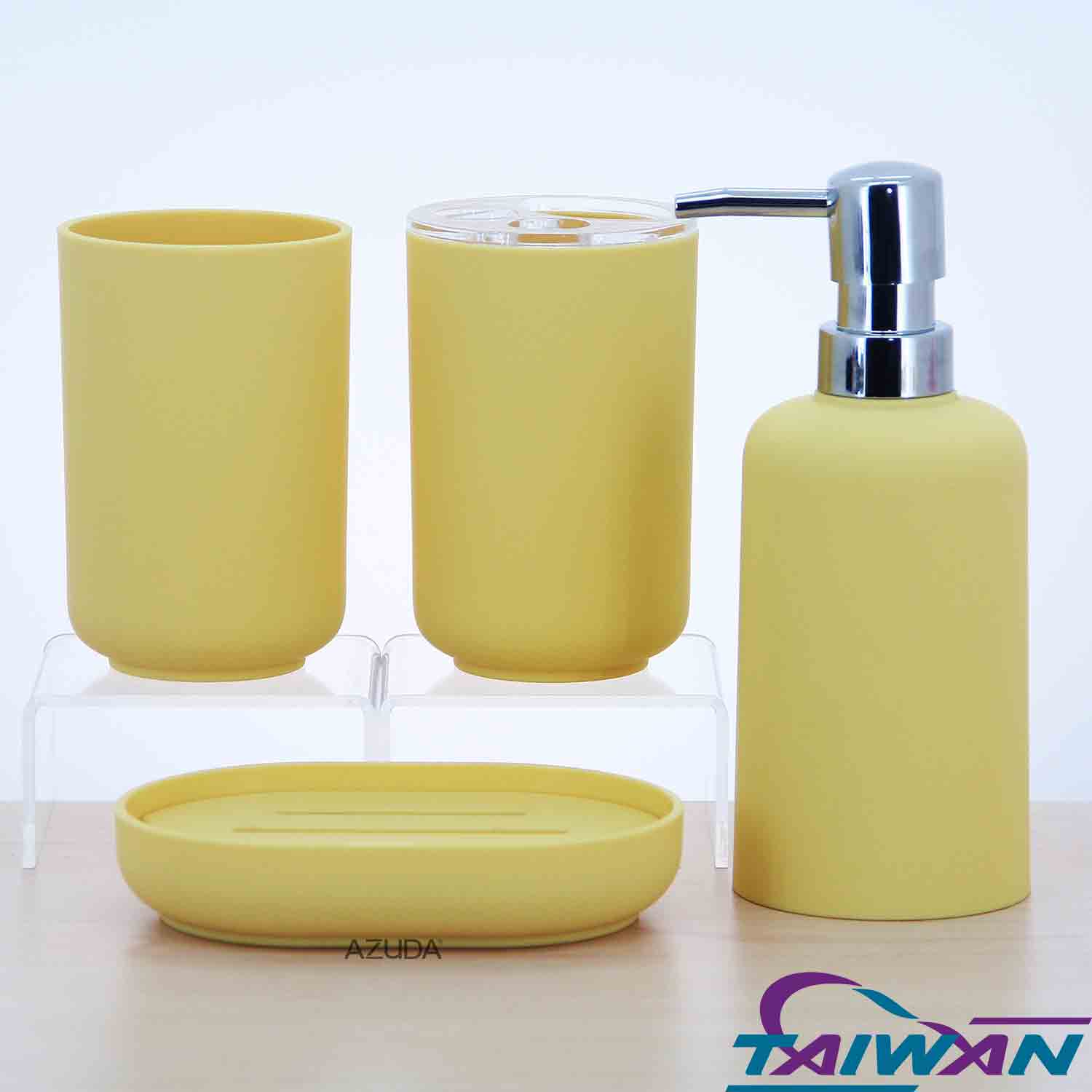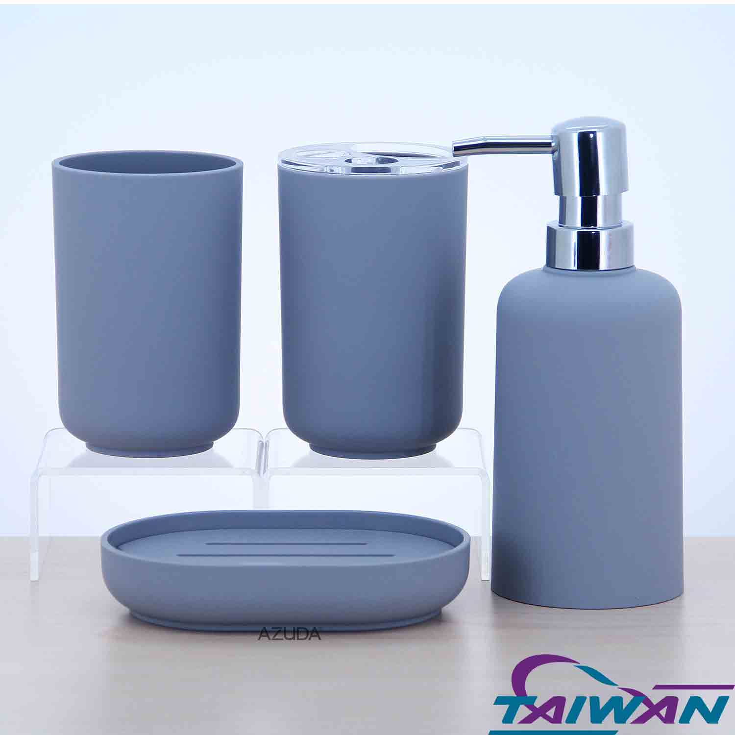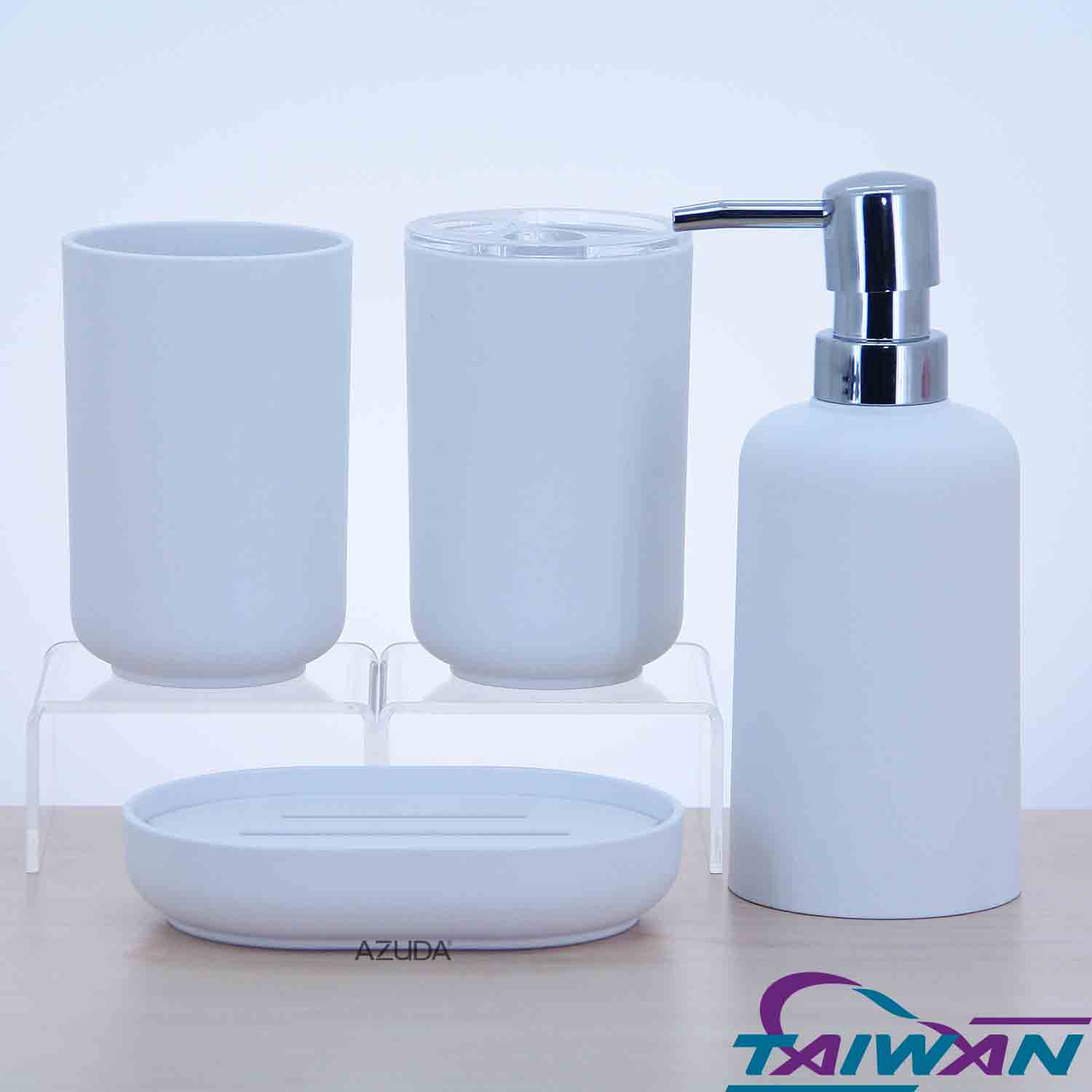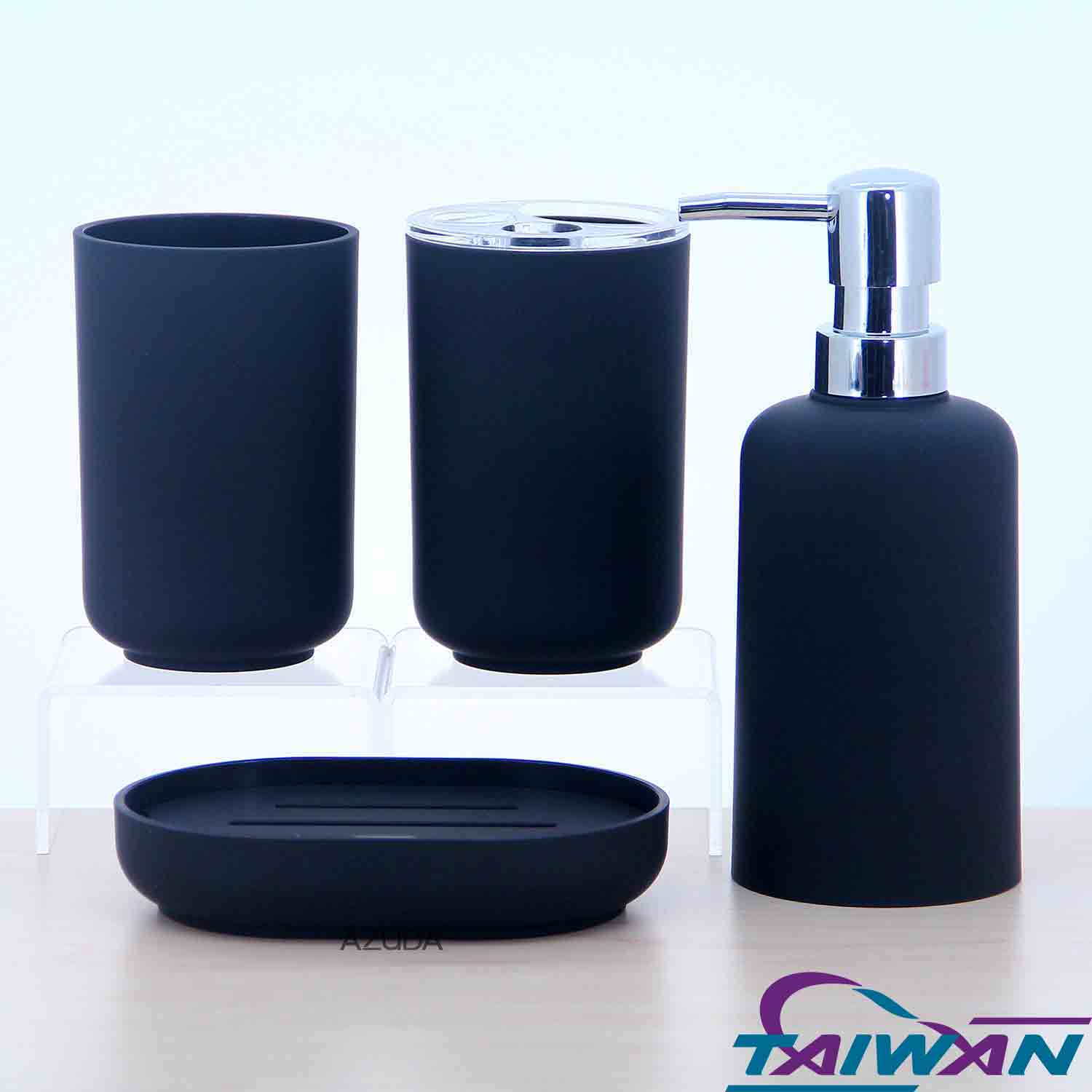 ABS BATHROOM ACCESSORIES SET W/RUBBER PAINTED & ROUND PLASTIC PUMP