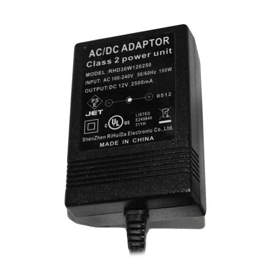 Displayed is an AC/DC adaptor that has a high output capacity of 2,500mA. As a class 2 power unit, this adaptor offers stable power supply to your devices. This AC/DC adapter is professionally made for a long lasting service time.