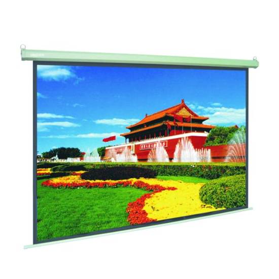This is an AC powered projector screen with a silvery colored metal holder. The projector screen is portable and can be hanged on the wall. A logo is printed on the top left part of the metal holder.