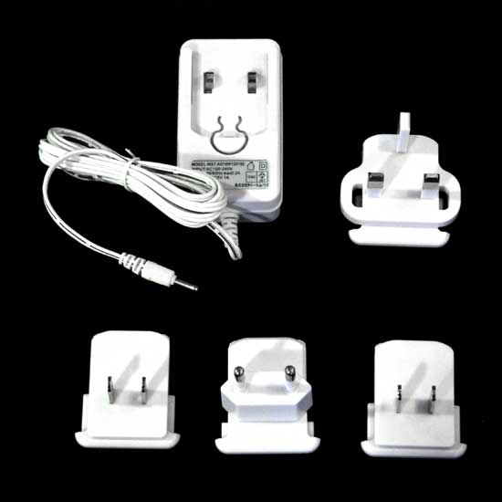 The displayed AC adaptor in white comes with interchangeable plugs to meet your various needs. It is compact in size for easy carrying and storing. The plastic construction enables it to serve for a long time.