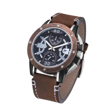4 pieces S/Steel 304L Case with IPB Plated and anti IPRG Plated Bezel, Black Dial with 3 eyes and Indexes, Silver color hands, S.Steel crown, Genuine Leather strap, 5ATM Water Resistance, Japan Quart Movement