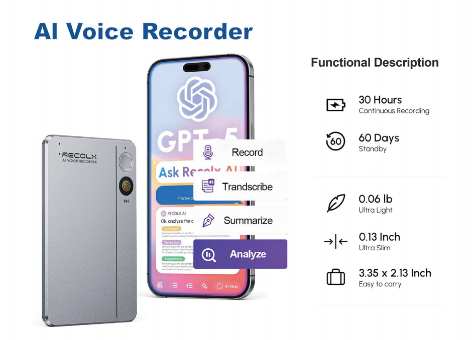 Recolx AI Voice Recorder, App Control, Transcribe & Summarize with 71 Pro Templates, Deep AI Analysis, Record Anytime Anywhere for Meetings, Work, Lectures, 112 Languages