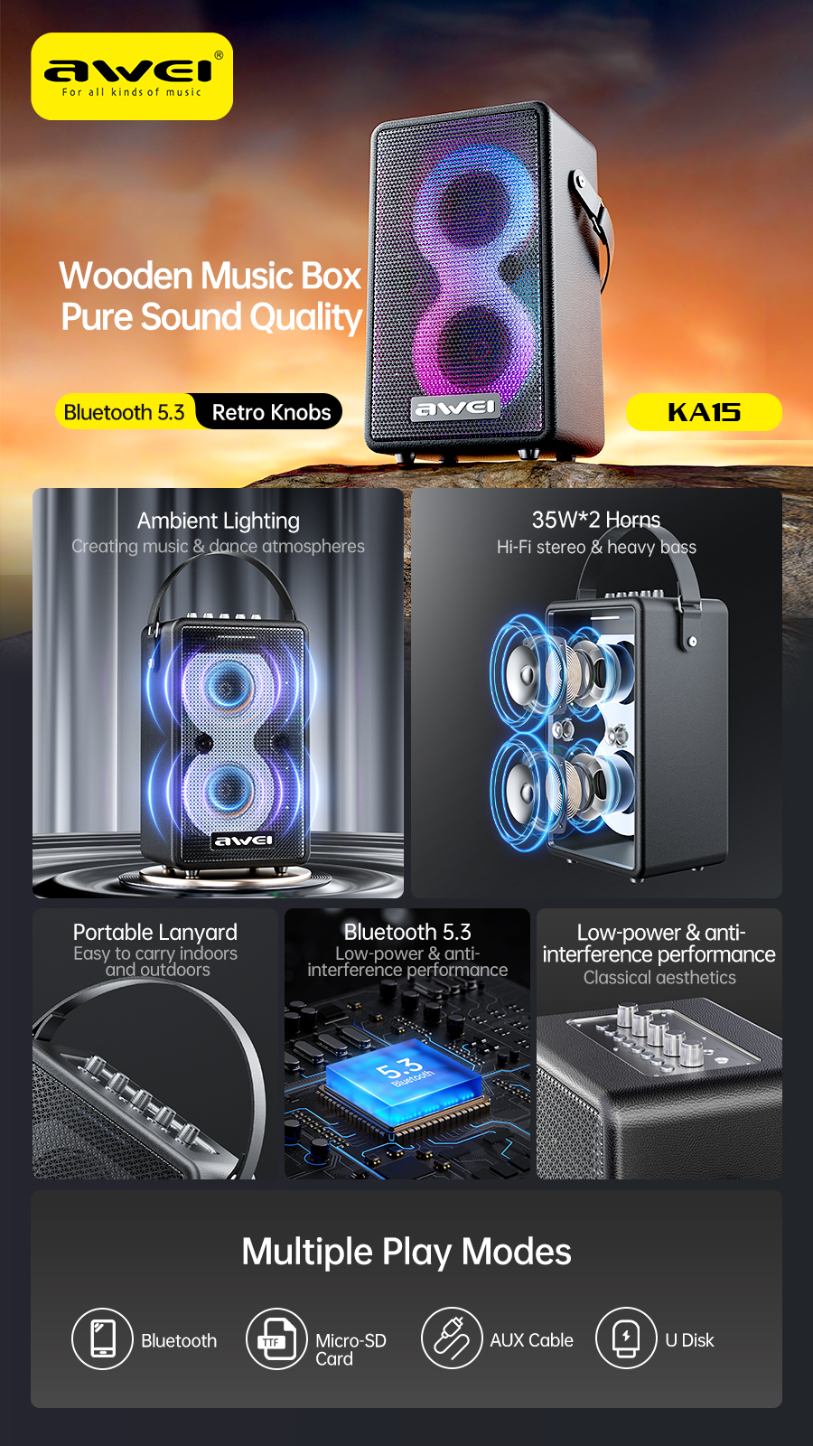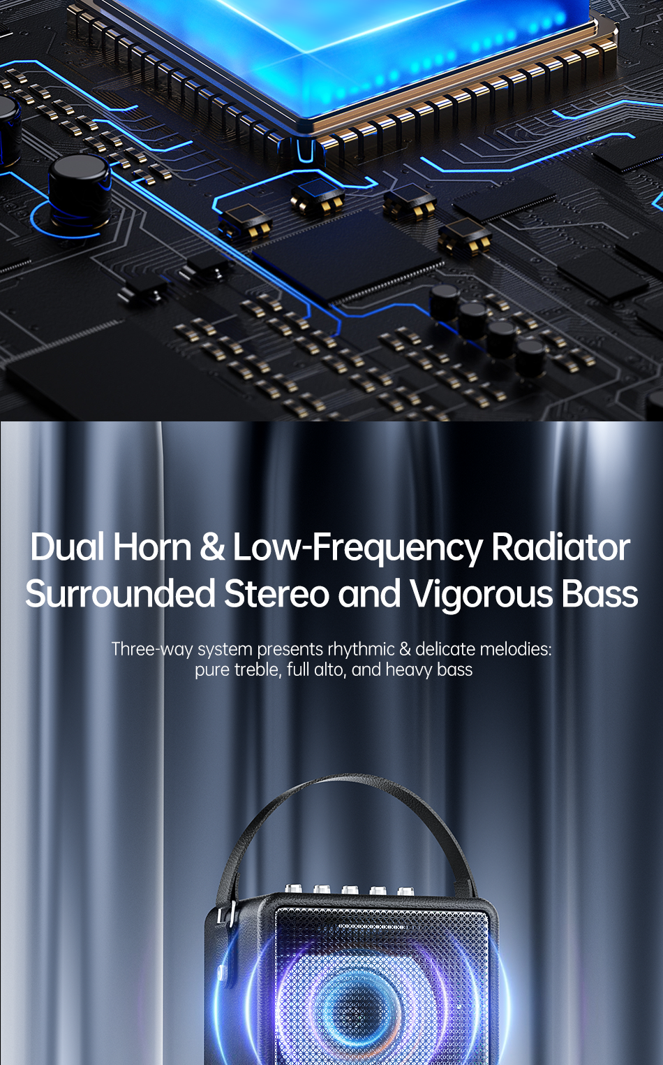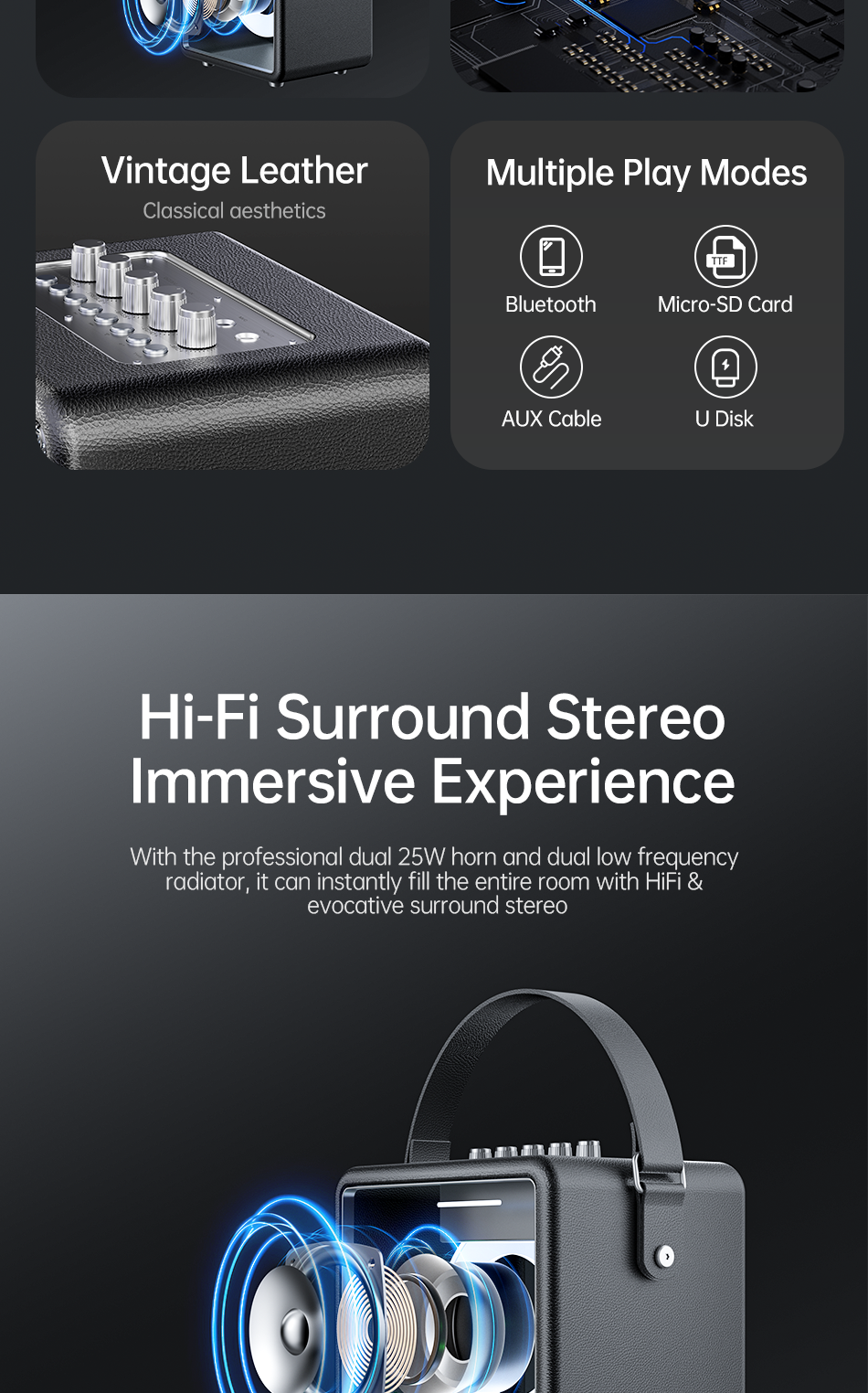 Supported audio sources: Micro-SD card, MIC, USB, BT, AUX, TWS