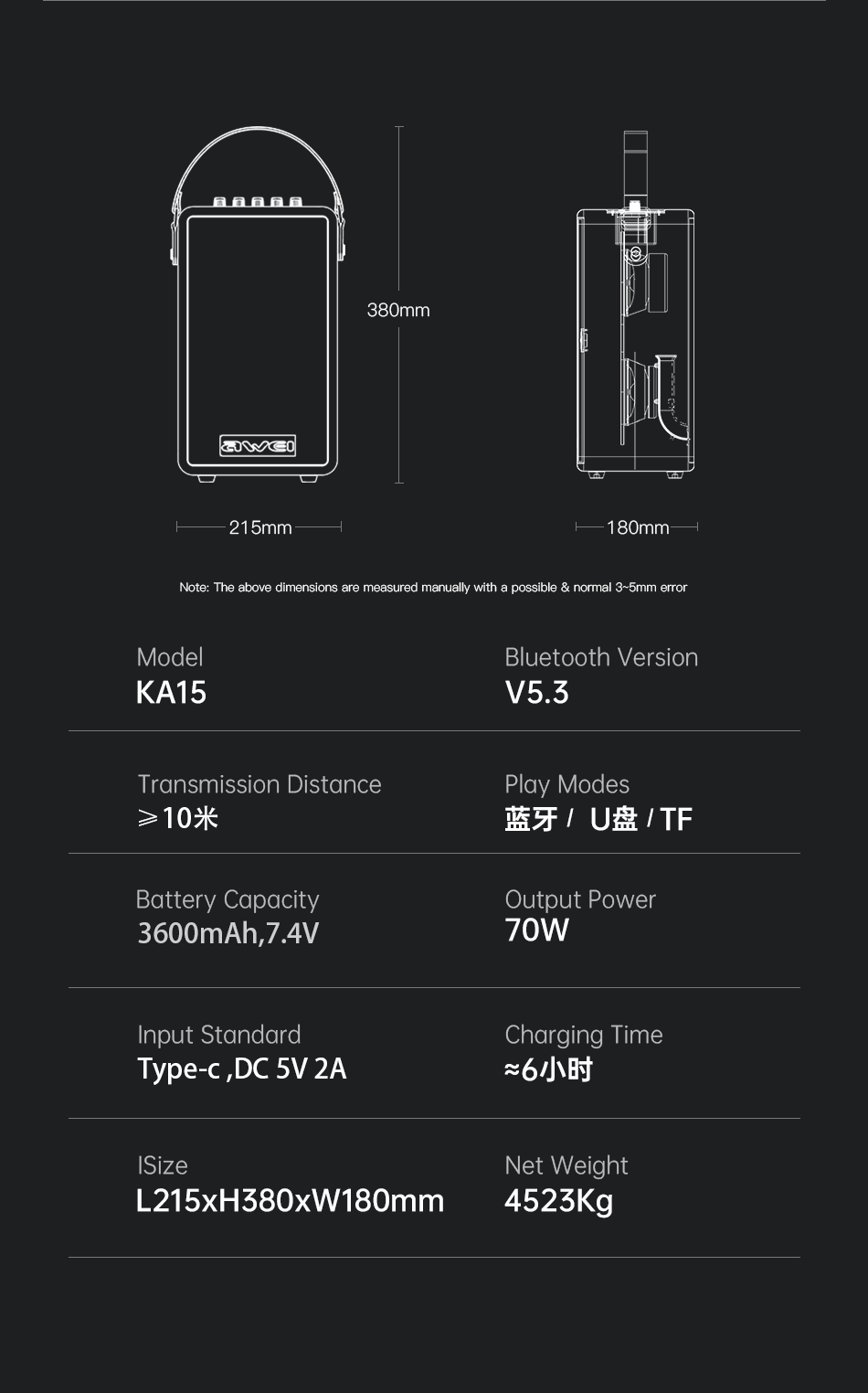Accessories: user manual, USB charging cable Supported audio sources: Micro-SD card, MIC, USB, BT, AUX, TWS