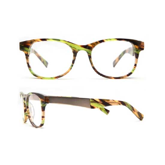 This is an acetate optical frame that is accented with brown and green striped patterns. The nose saddle bridge ensures maximum wearing comfort. The outstanding appearance makes it perfect for both fashion and professional eyeglasses.