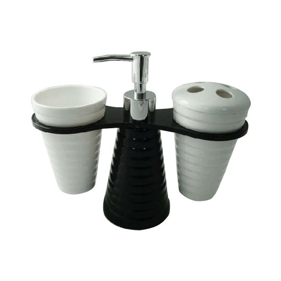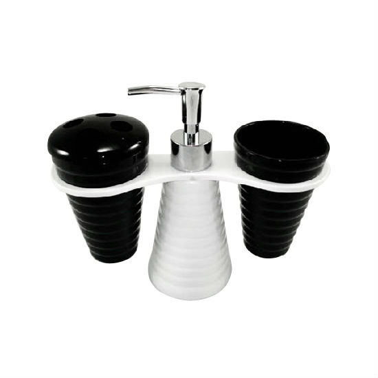 • Set of 3pcs acrylic bath set (soap dispenser-black, toothbrush holder & tumbler in white, with plastic pump in chromed). Size: 19.5 x 8 x 17cm H.