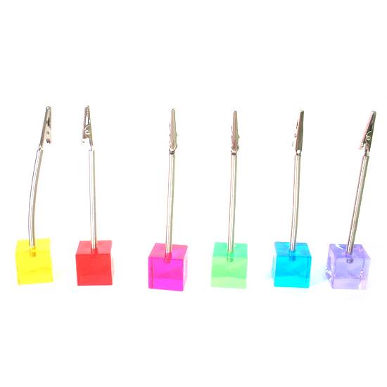 The acrylic card clip is suitable to display memos, name card and photos. There is a metal clip which is stand on the holder. The clip is swing in the wind.