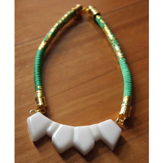 The necklace is hung with an acrylic pendant showcasing a serrated appearance and incised details. The pendant is held securely by two batik cords which remind you of the marvelous Indonesian art. Classic and cultural, this necklace will add lots of taste and visual interest to any ensemble.