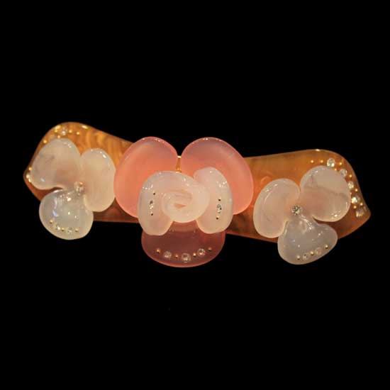 Showcased is an acrylic hair clip with a pretty floral design. The delicate crystal accents offer added elegance and beauty. This lovely hair clip with a mild tone makes a great fashion accessory for ladies.