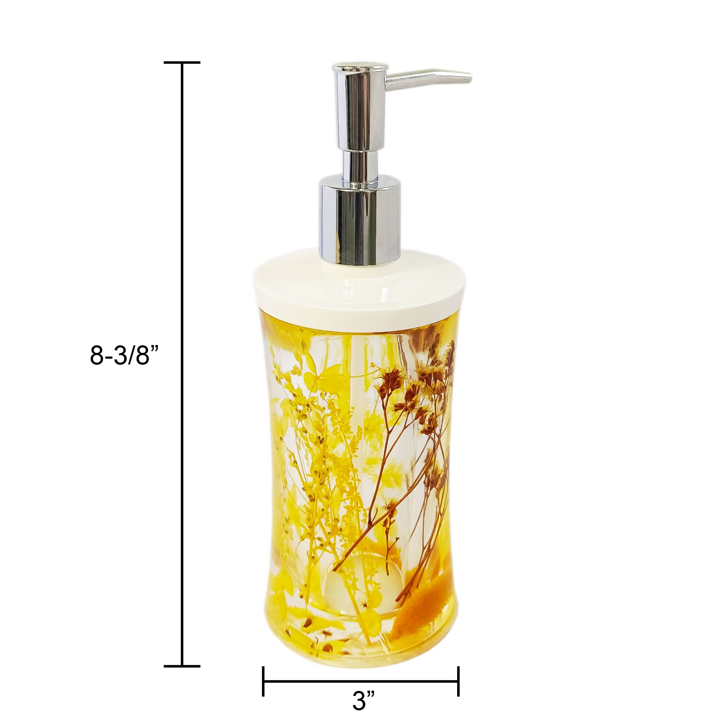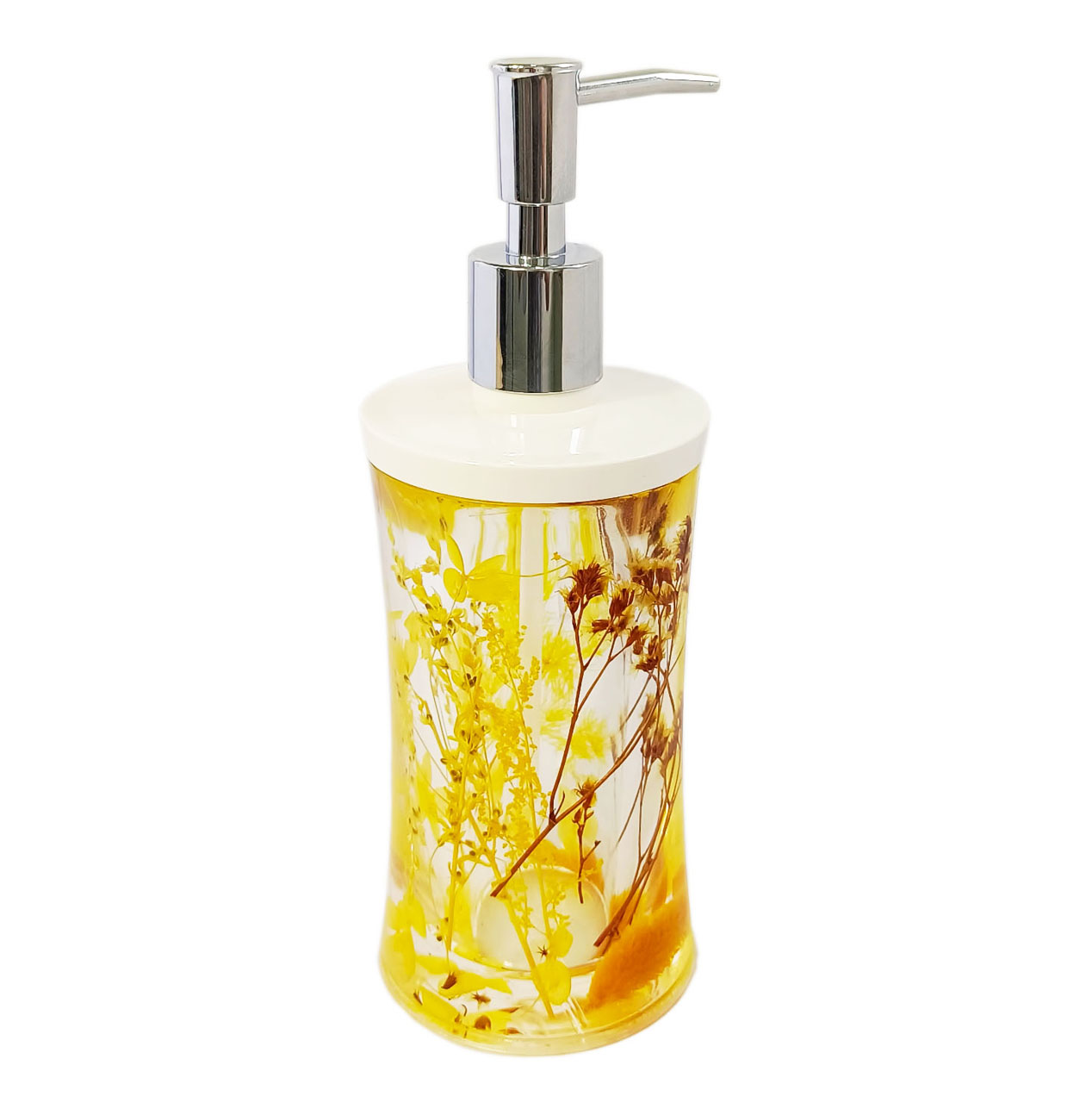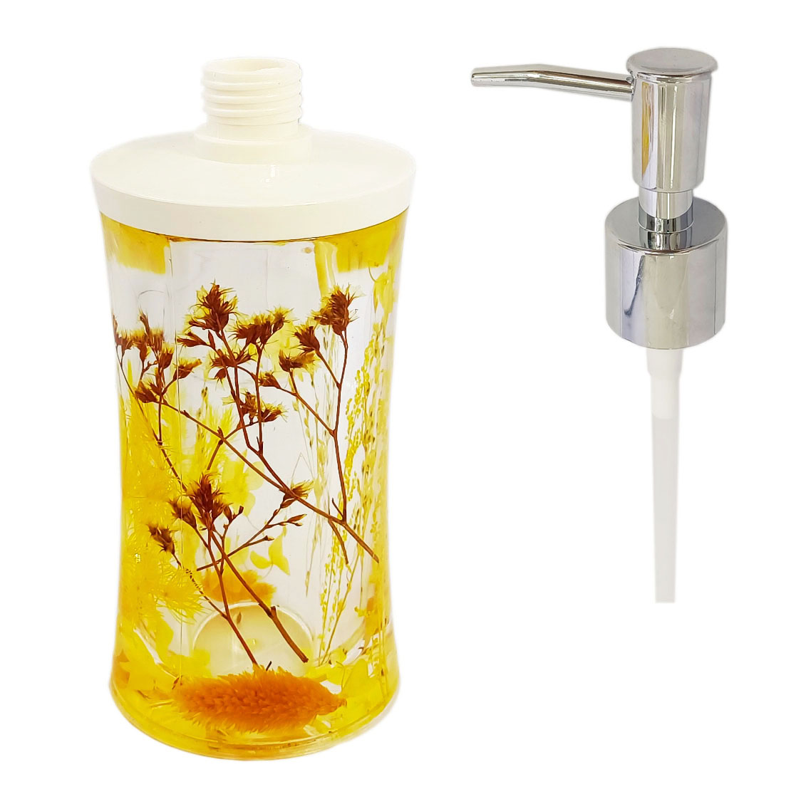 Luxury acrylic lotion bottle with sealed dried flower decor. High-grade transparent material, durable & anti-fade. Leak-proof pump design, elegant and practical. Great for skincare lotion storage, home decoration & gift packaging
