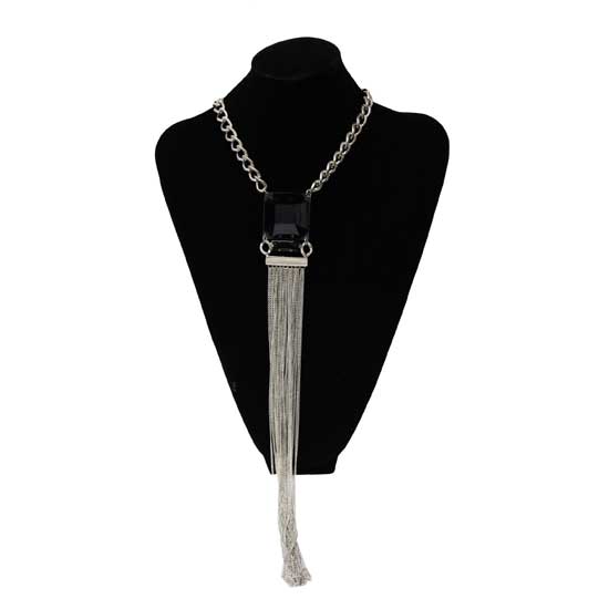Displayed is an acrylic necklace featuring a metal chain with big interlocked rings for a fashionable style. This necklace is designed with a long draped metal chains for a waterfall effect, which adds volume to the piece. This trendy acrylic necklace goes especially well with long dresses.