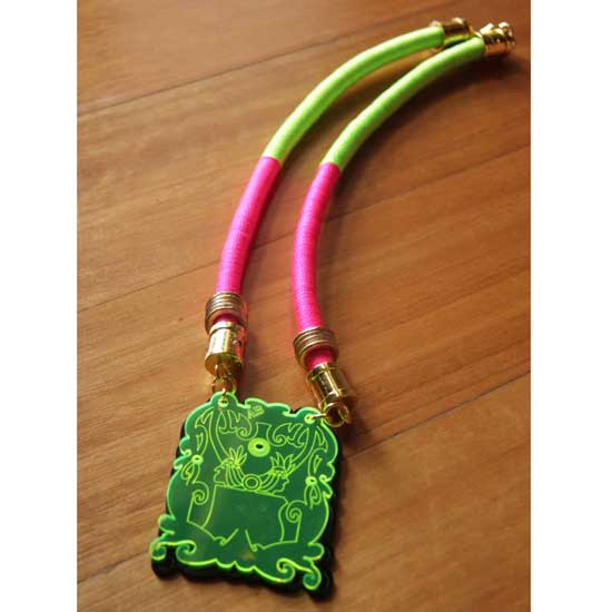 This necklace features a unique neon pendant made from green and black acrylic panels. The pendant is connected to two thick cords displaying an engaging double-toned design. This distinctive piece will decorate and accentuate your neckline with a touch of character and ethnicity.