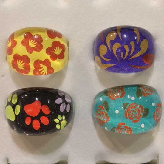 This fancy series of acrylic rings features attractive, fashionable floral patterns. The bold mix of colors presents a fun and youthful style. These adorable rings add extra touch of sweetness to your everyday look.