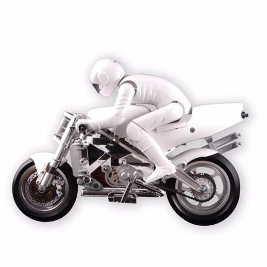 This is an action figure that is ideal for room decoration. Mainly it is designate in a human figure that is riding on a motorbike, and dress in pure white costume. The figure is in significant craft.