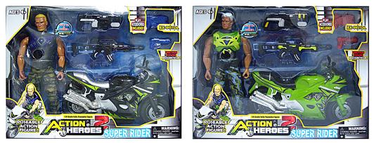 This action figurine set features a muscular hero and a motorbike. It also includes different types of guns like pistols and machine guns. With these items, various postures and models can be created by children. This item brings endless fun to them.