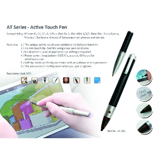Active Touch Pen with small tip for more precise touch/writing function on smart phones and tablets, also combining ball pen function for normal writing on paper.