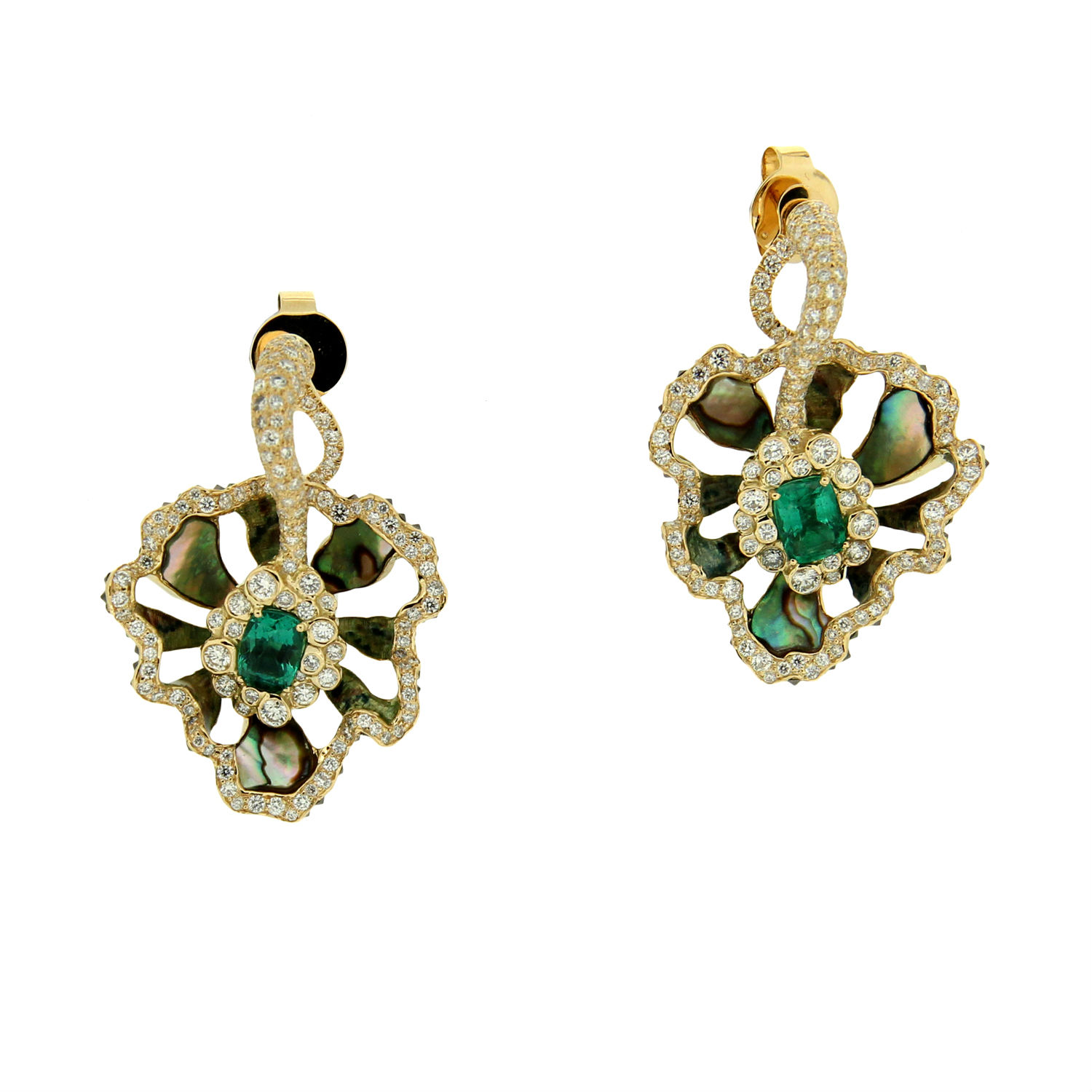 Eve is smitten by his magnetism, his charm, his thoughts... She is overwhelmed by Adam's aura. Vibrant Emeralds clustered with Diamonds, weighing 2.34 carats form the centers of very abstract backgrounds and exquisite Champleve style French enamel that borrows its hues from the Abalone. With 4.97 carats of brilliant cut diamonds, this earring can be worn in more than two ways and has been detailed with textures even at the back. It has taken 248 work hours to design and hand-craft this unique yet wearable MASTERSTROKES earring.